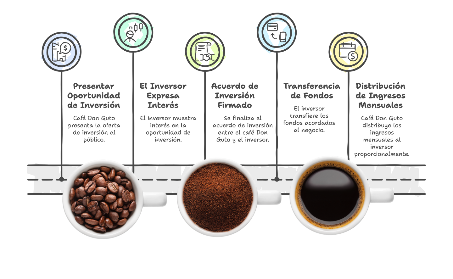 - Los inversores se asocian con Café Don Guto y comparten las ganancias mensuales del establecimiento.